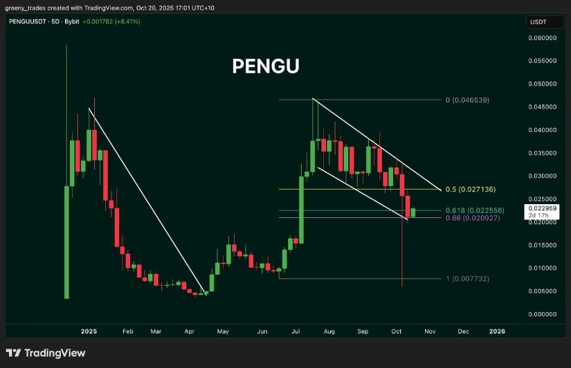 Greeny, этот мастер графиков, раскрывает рыночную структуру, чистую, как только что вымытый самовар. 🫖 PENGU удерживает свой золотой карман между уровнями Фибоначчи 0.618-0.66, зоной столь же важной, как нос в лице главного героя Гоголя. 👃 Цена пытается пробить нисходящий канал, сигнал столь же ясный, как колокол в русской деревне. 🔔