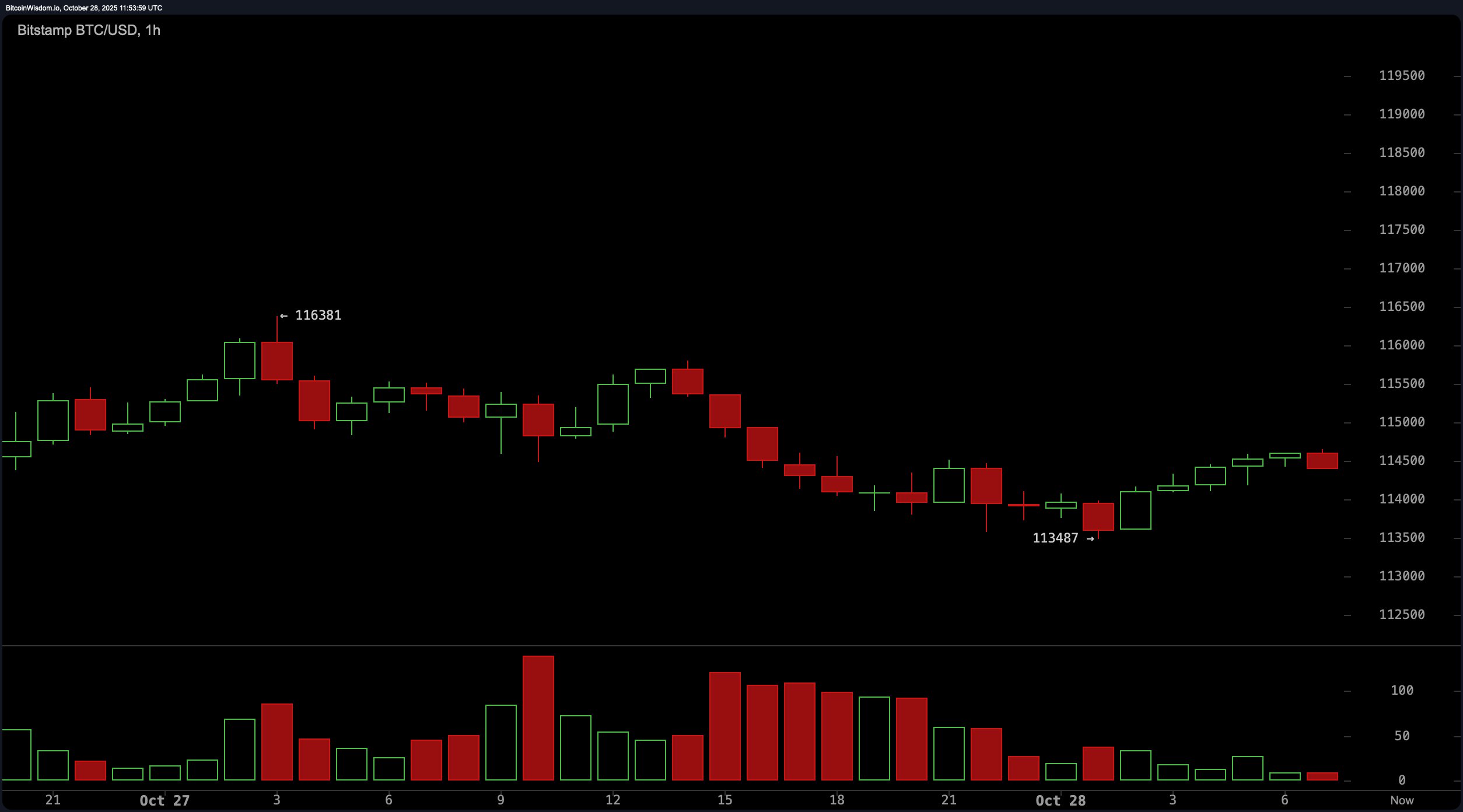 Четырёхчасовой график показывает более обнадеживающую, хотя и капризную, романтику. После ступенчатого роста после 23 октября, господин Bitcoin достиг ошеломляющих £116,381, прежде чем отступить, чтобы поворчать. Сейчас он зависает выше £114,000, его свечи маленькие и нерешительные — как поклонник, проверяющий свое отражение перед предложением. Повторное тестирование £113,500 может сигнализировать о трусости, а скачок выше £116,400 может возродить его разгульный шарм. 🚀